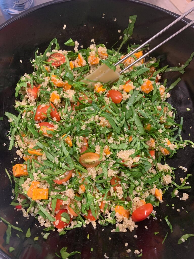 - Nu blandes salaten: Hæld quinoaen i en stor skål og tilsæt revet citronskal og chili. Rør det godt rundt så det bliver fordelt. Tilsæt derefter de bagte sødekartofler, den hakkede spinat, de halverede cherrytomater og yoghurtdressingen.